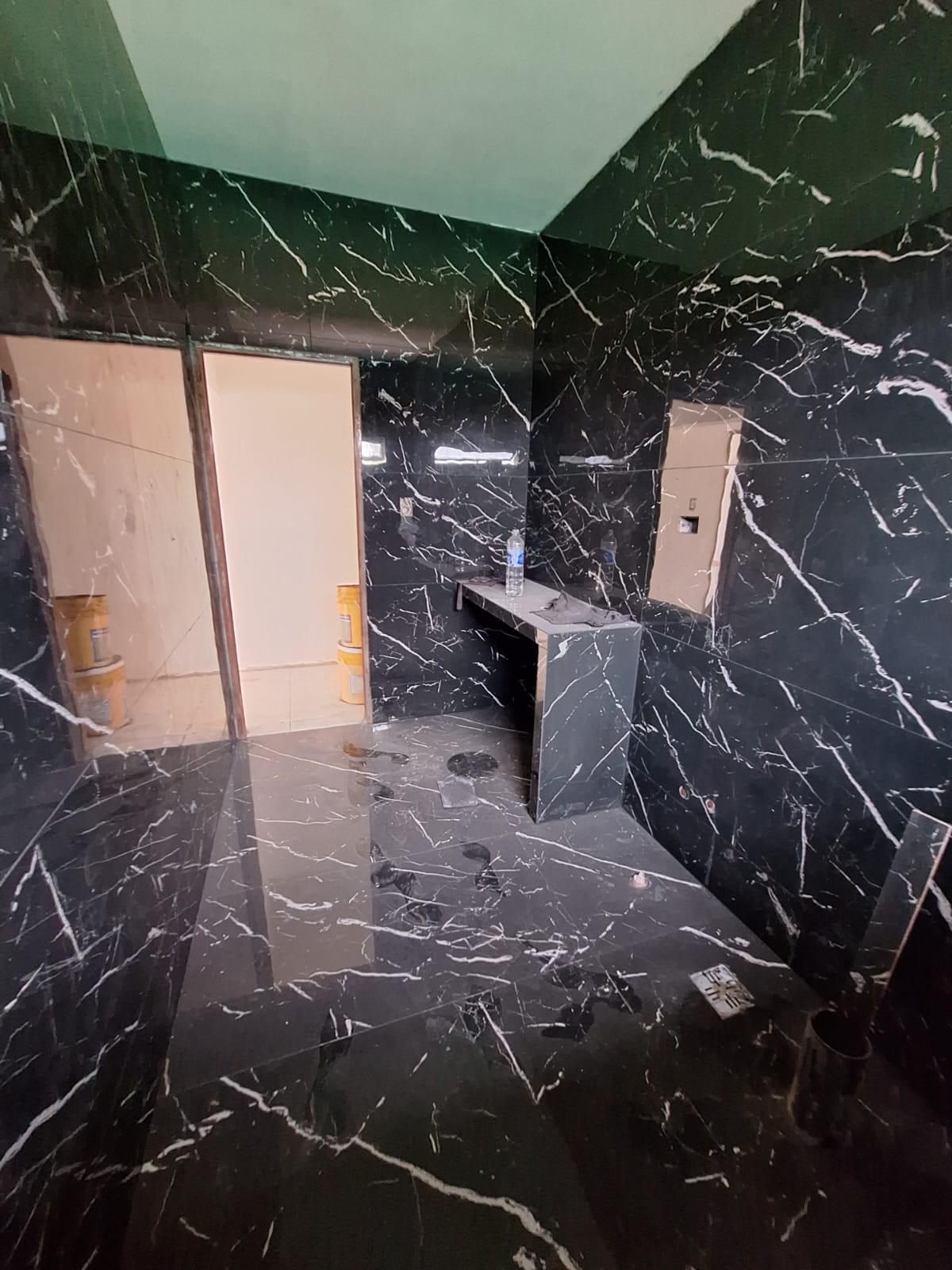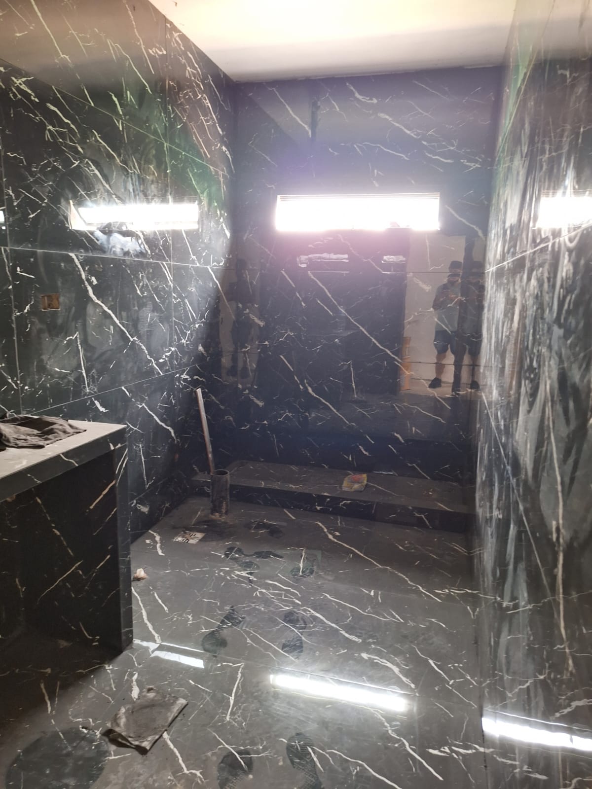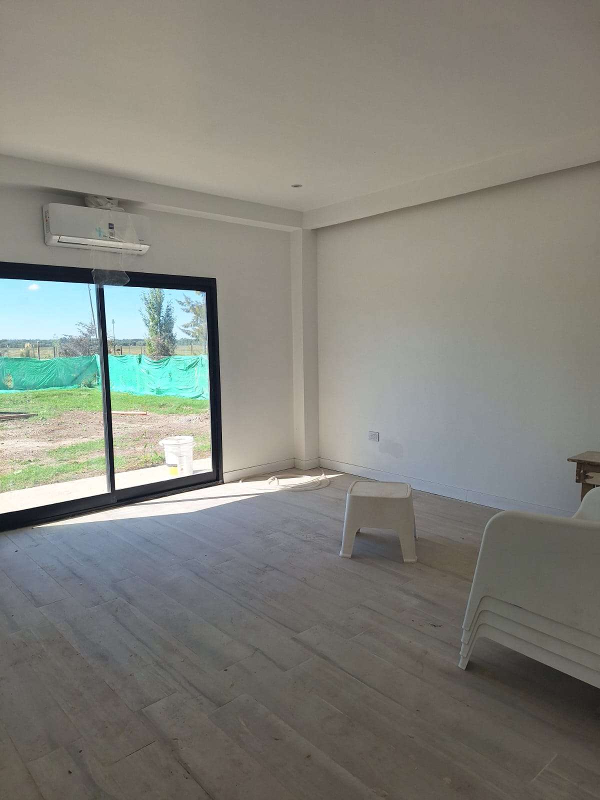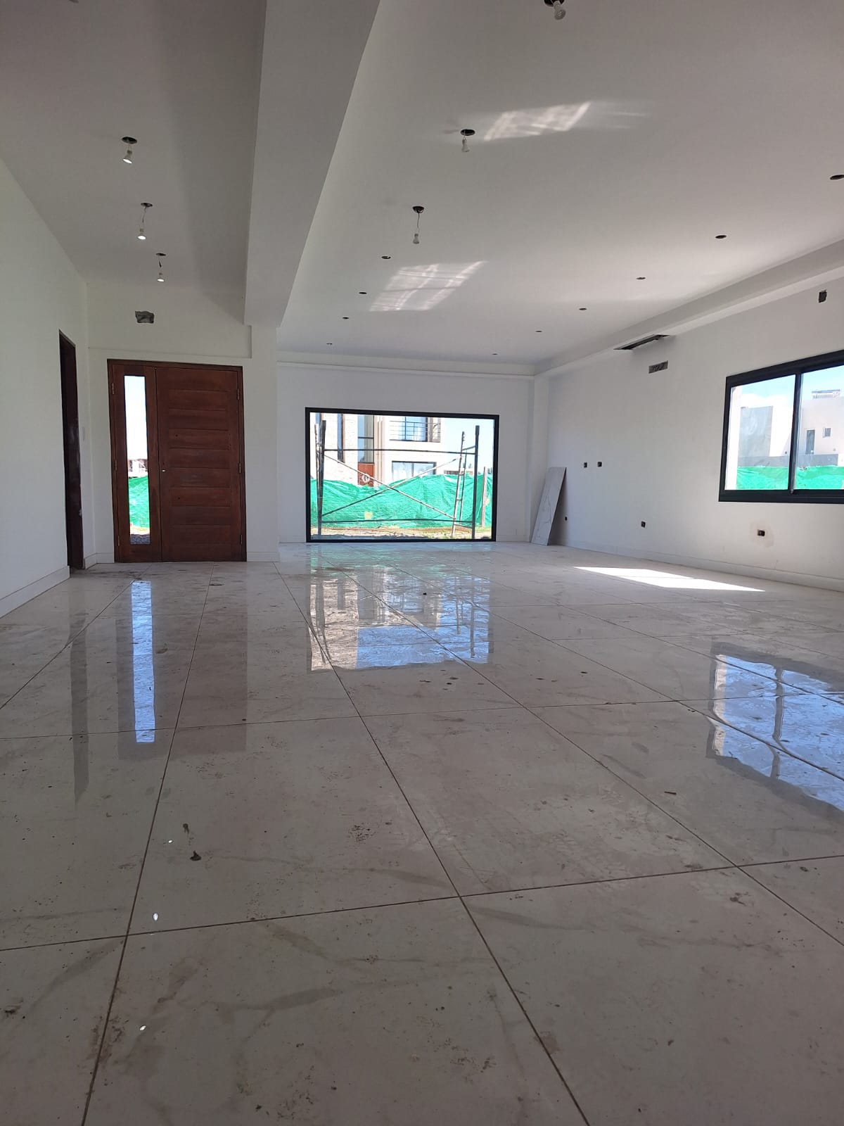Vivienda moderna en barrio cerrado con volumetria de planta baja, revestimiento de piedra laja gris, galeria semicubierta con pileta, pisos de porcelanato pulido, banos con porcelanato negro marmolado y carpinteria de aluminio negro con DVH.