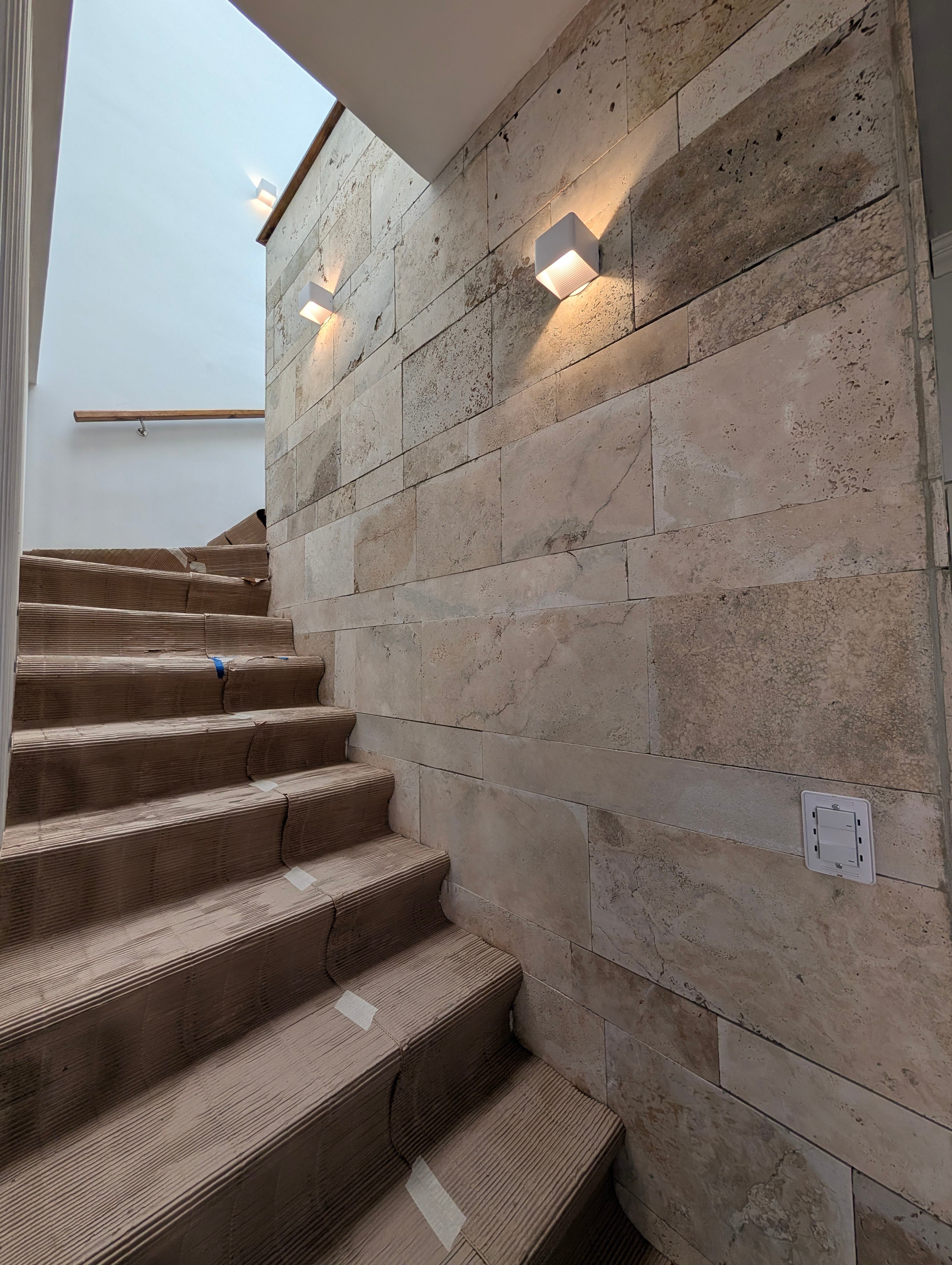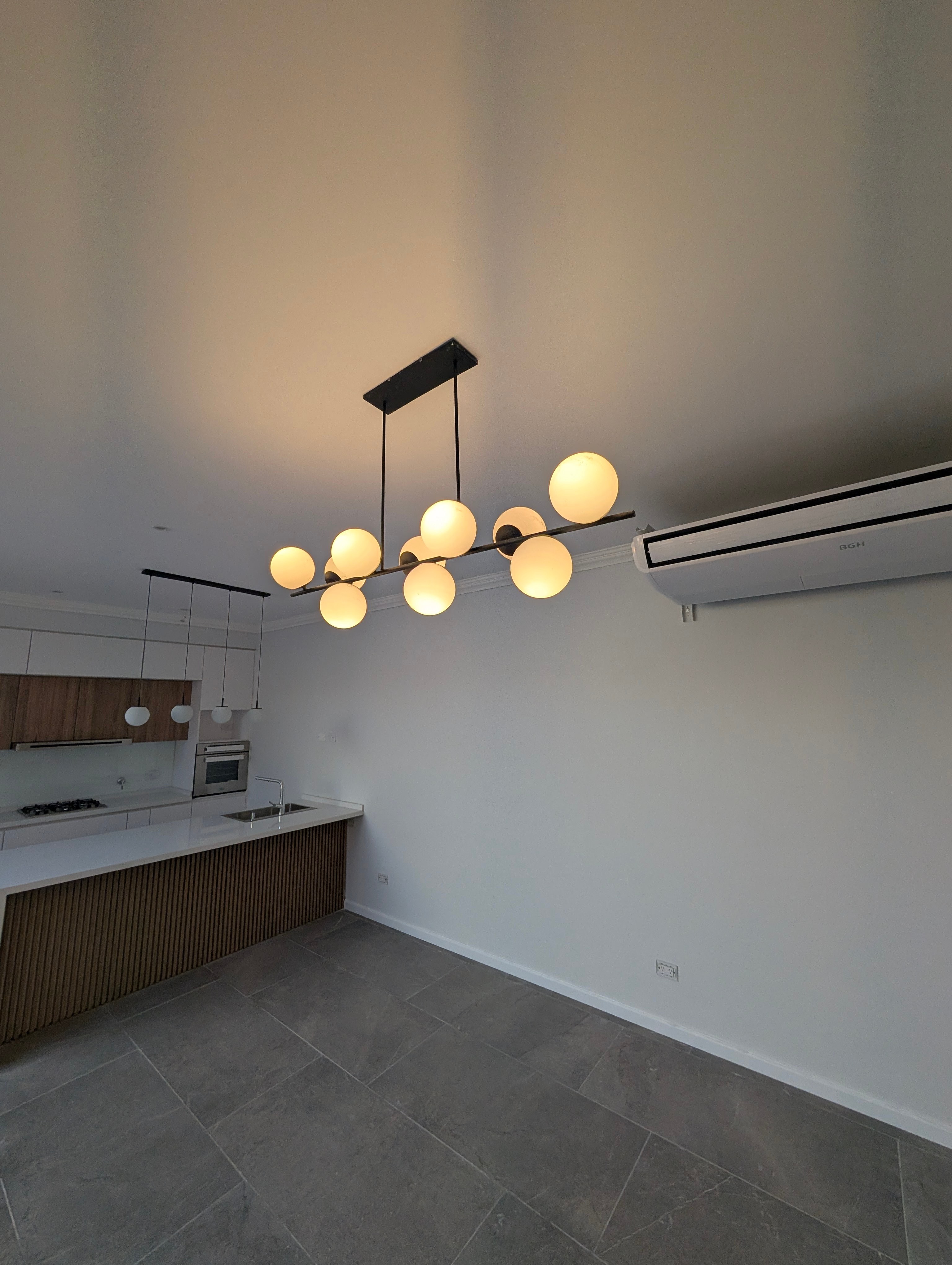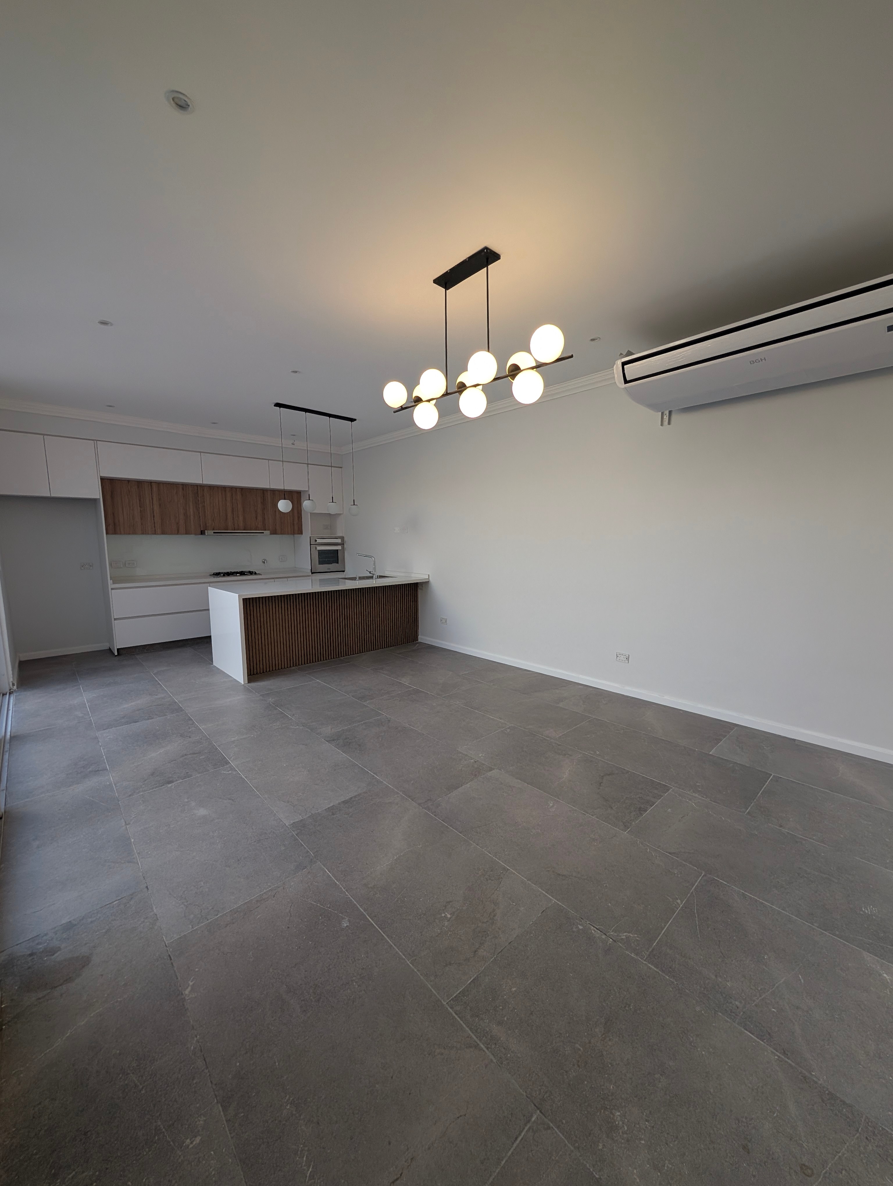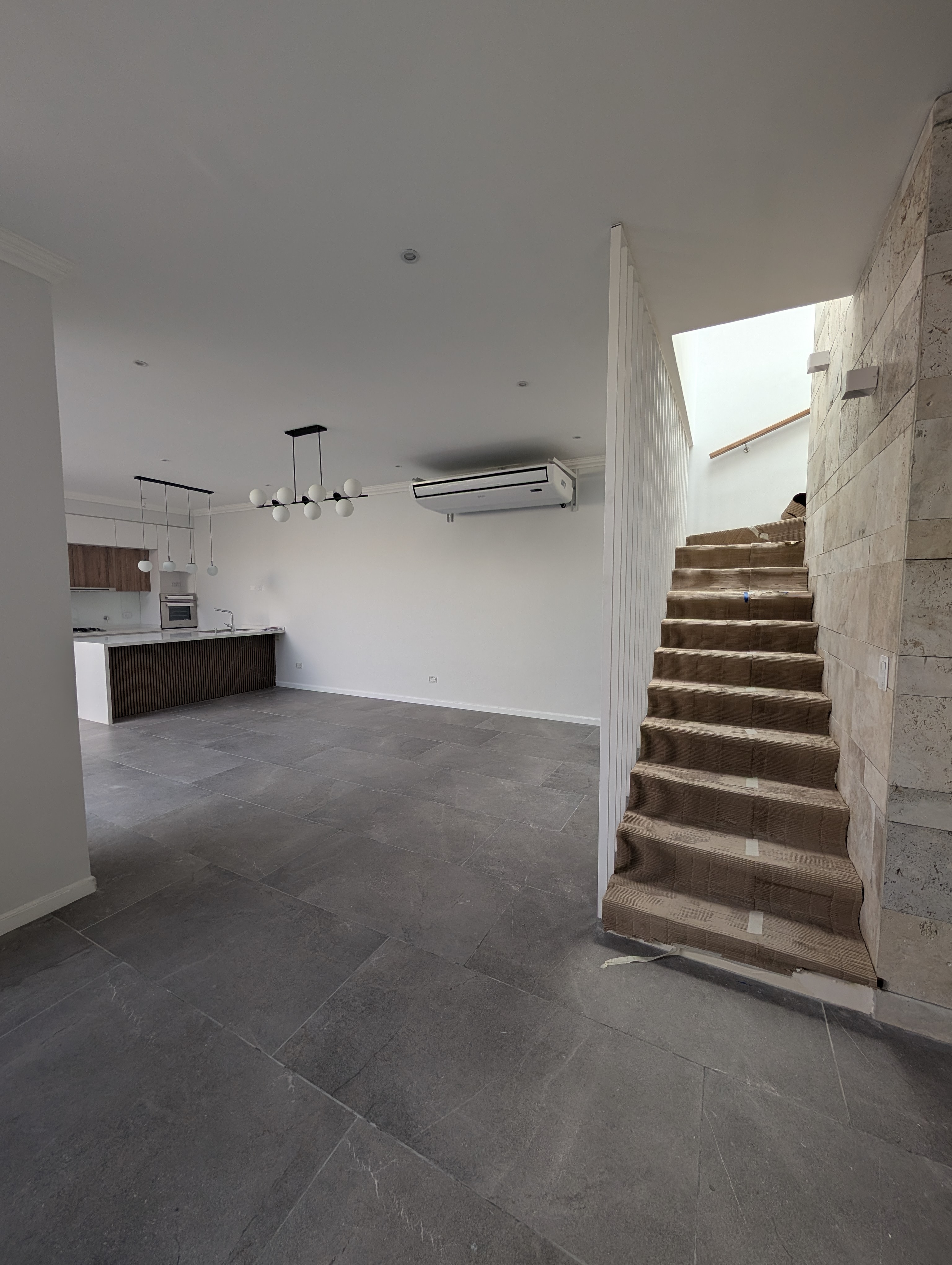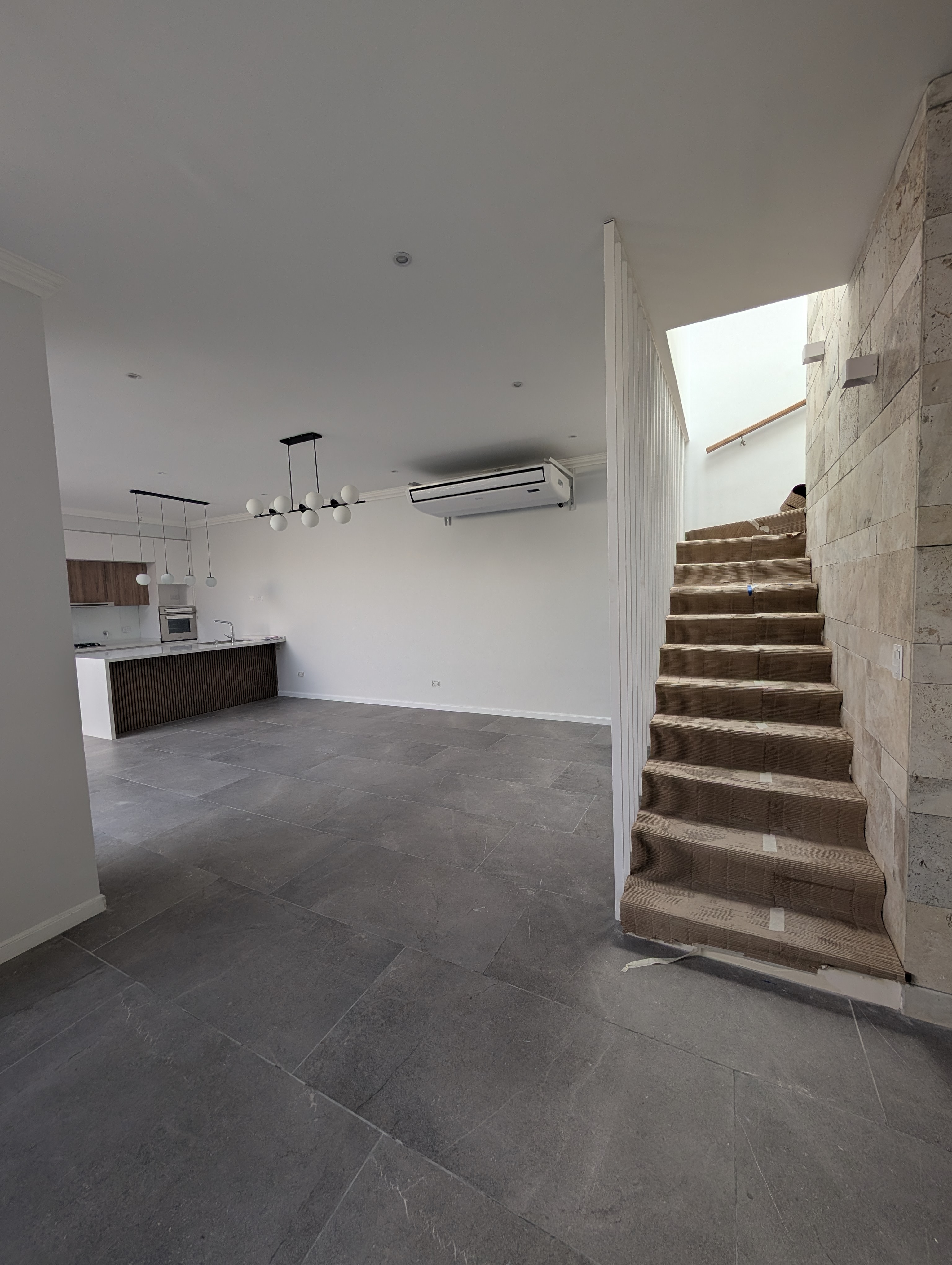 Proyecto residencial con diseño interior contemporáneo, cocina con isla de listones de madera y acabados minimalistas.