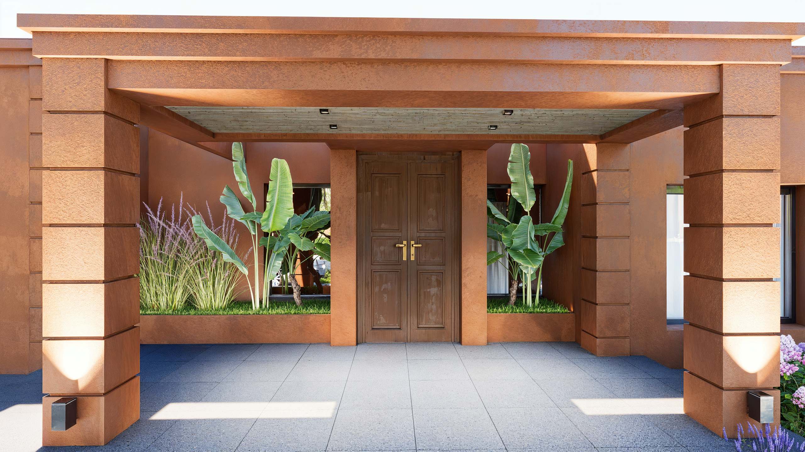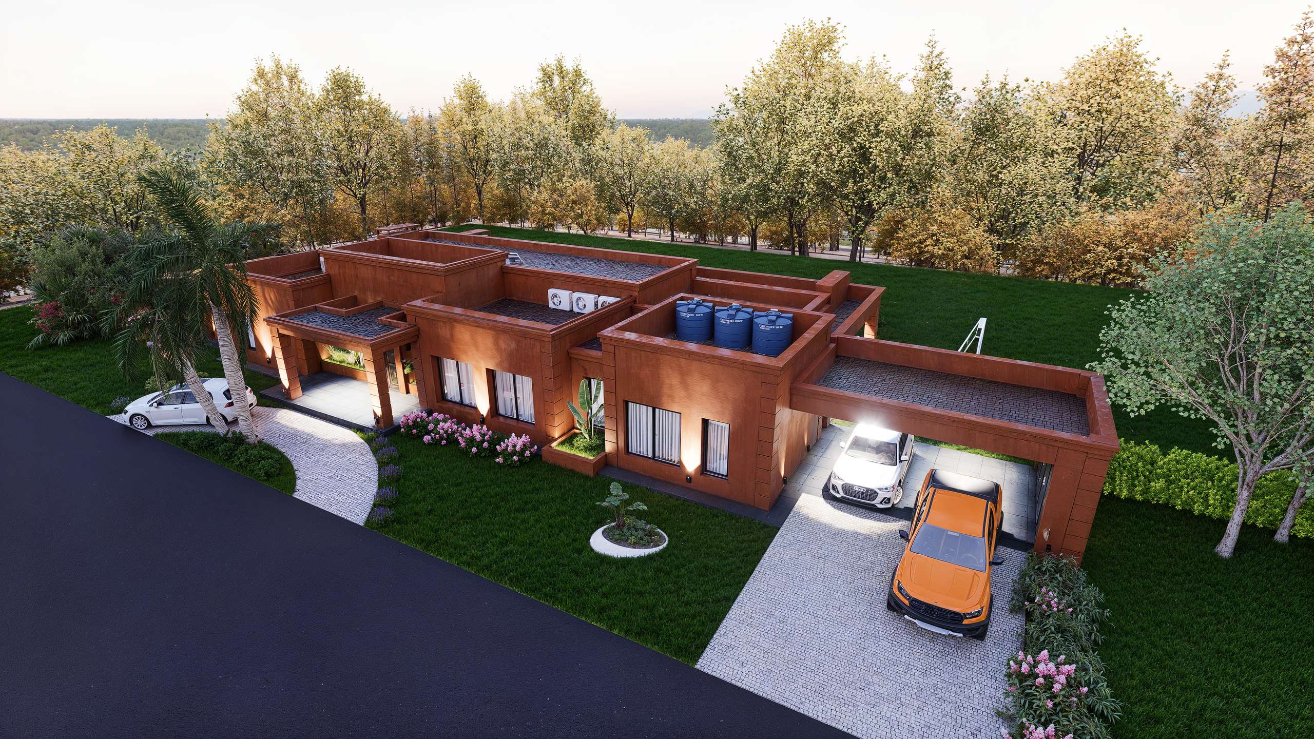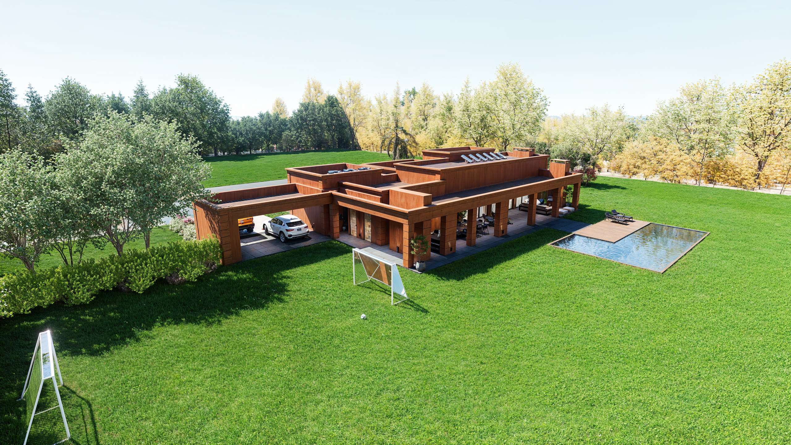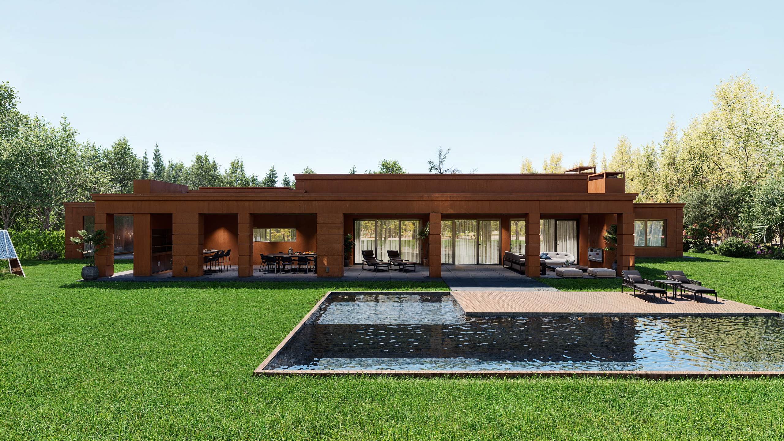 Vivienda residencial con fachada de acero corten, pileta con deck de madera y galería abierta al paisaje.